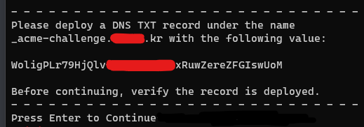 $ docker run -it --name certbot -v 'C:\Data\KKorea\cert\etc:/etc/letsencrypt' \ -v 'C:\Data\KKorea\cert\var:/var/lib/letsencrypt' certbot/certbot certonly \ -d kkutukorea.com -d *.kkukowiki.kr -d *.kkutukorea.com \ --manual --preferred-challenges dns --server https://acme-v02.api.letsencrypt.org/directory \ --email foo@domain.com --agree-tos --expand --renew-by-default --manual-public-ip-logging-ok -