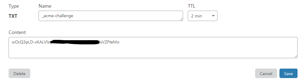 인증 중간에 위와 같이 도메인의 TXT 레코드를 등록해달라는 문구를 마주하게 된다. 각자의 DNS 관리 페이지에서 해당 값을 설정해주자. 아, TTL 은 최대한 짧게 설정하자. 필자는 2분으로 설정했다.